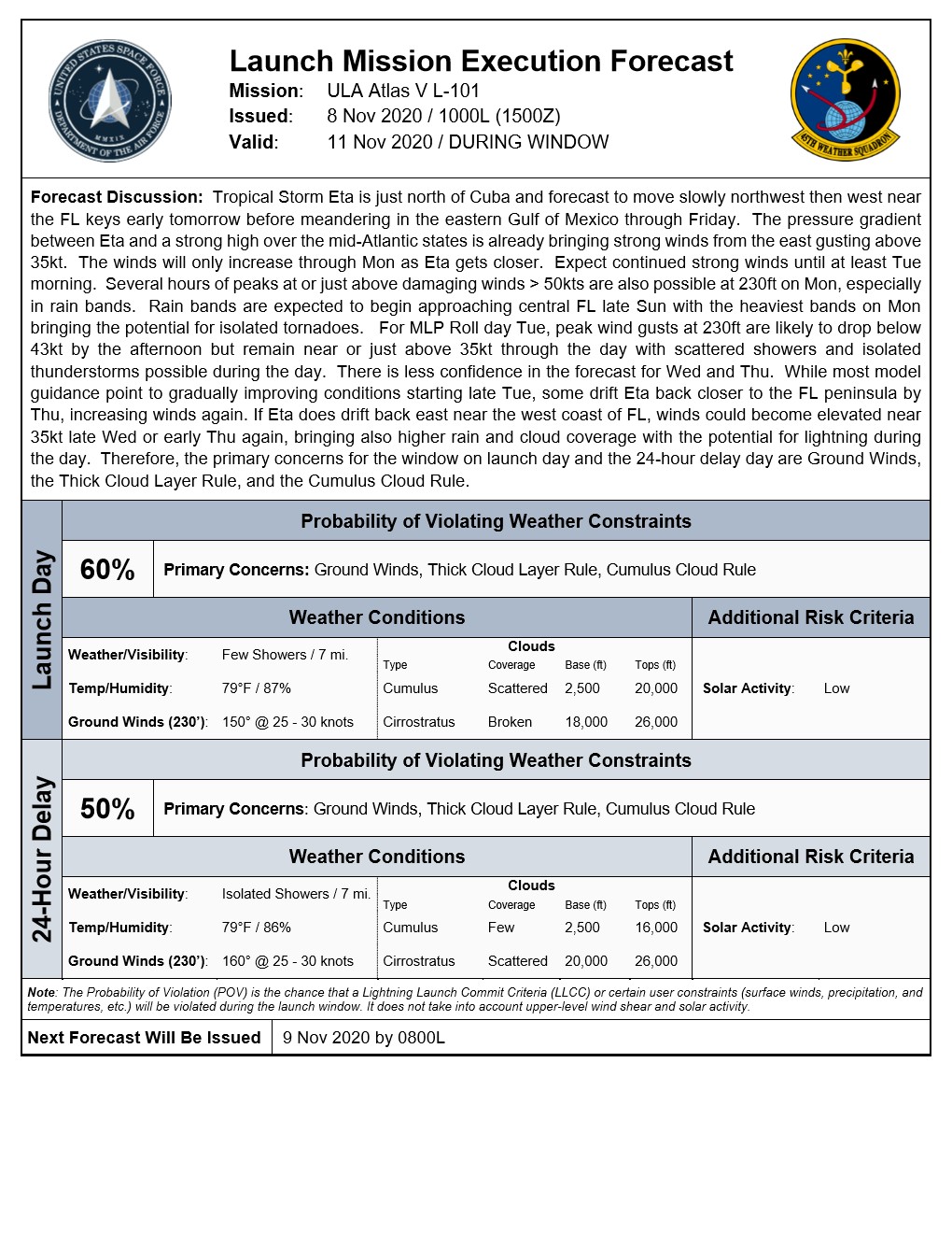 Atlas V L-101 L-3 Day Forecast for 11 Nov Launch