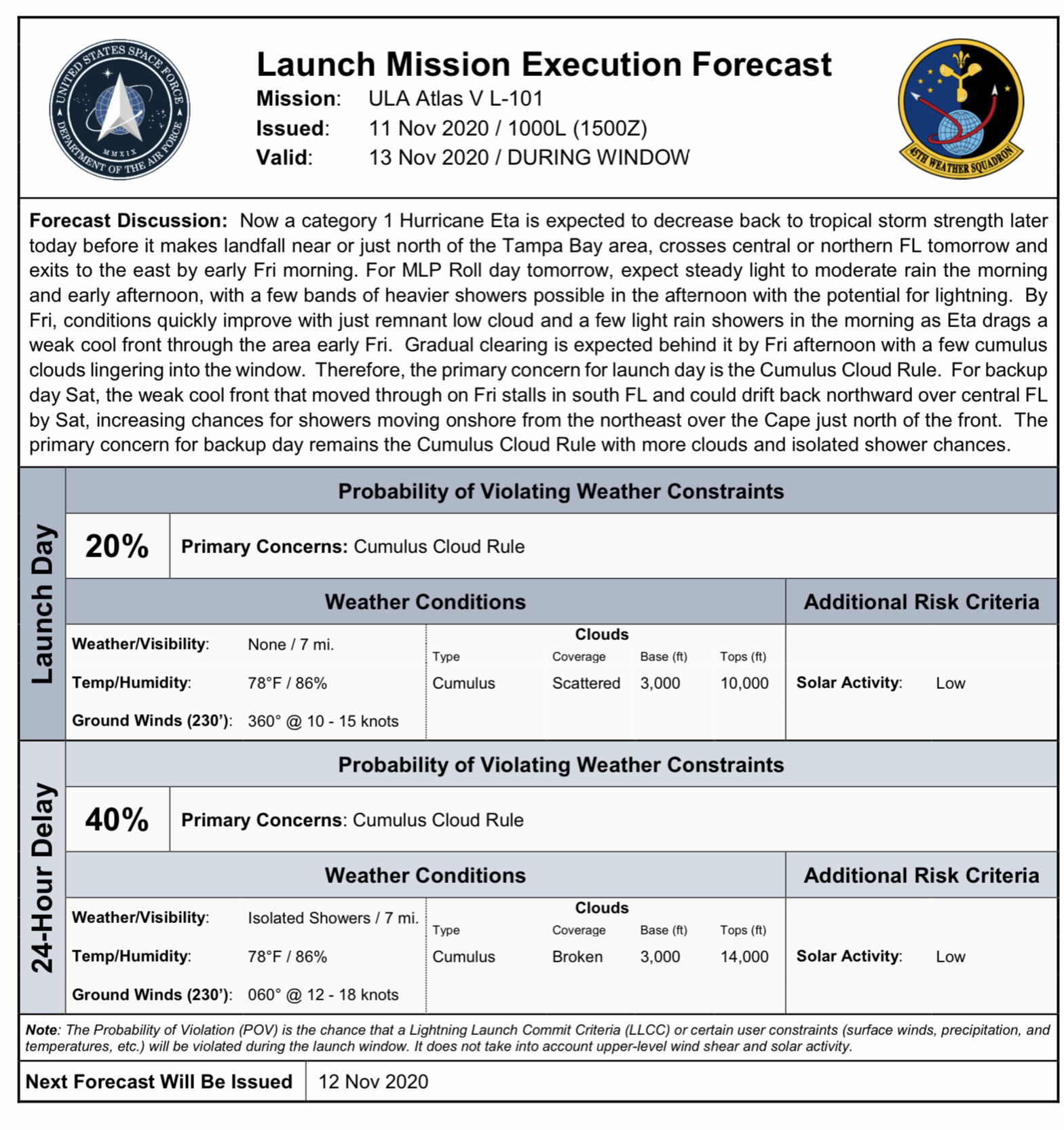 Atlas V L-101 L-2 Day Forecast for 13 Nov Launch
