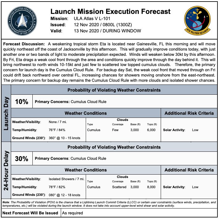 Due to impending weather and uncertainty related to Tropical Storm Eta, ULA is now targeting Thur., Nov. 12, at 5:18 p.m. EST for the launch of the #NROL101 mission for the @NatReconOfc, pending range approval.