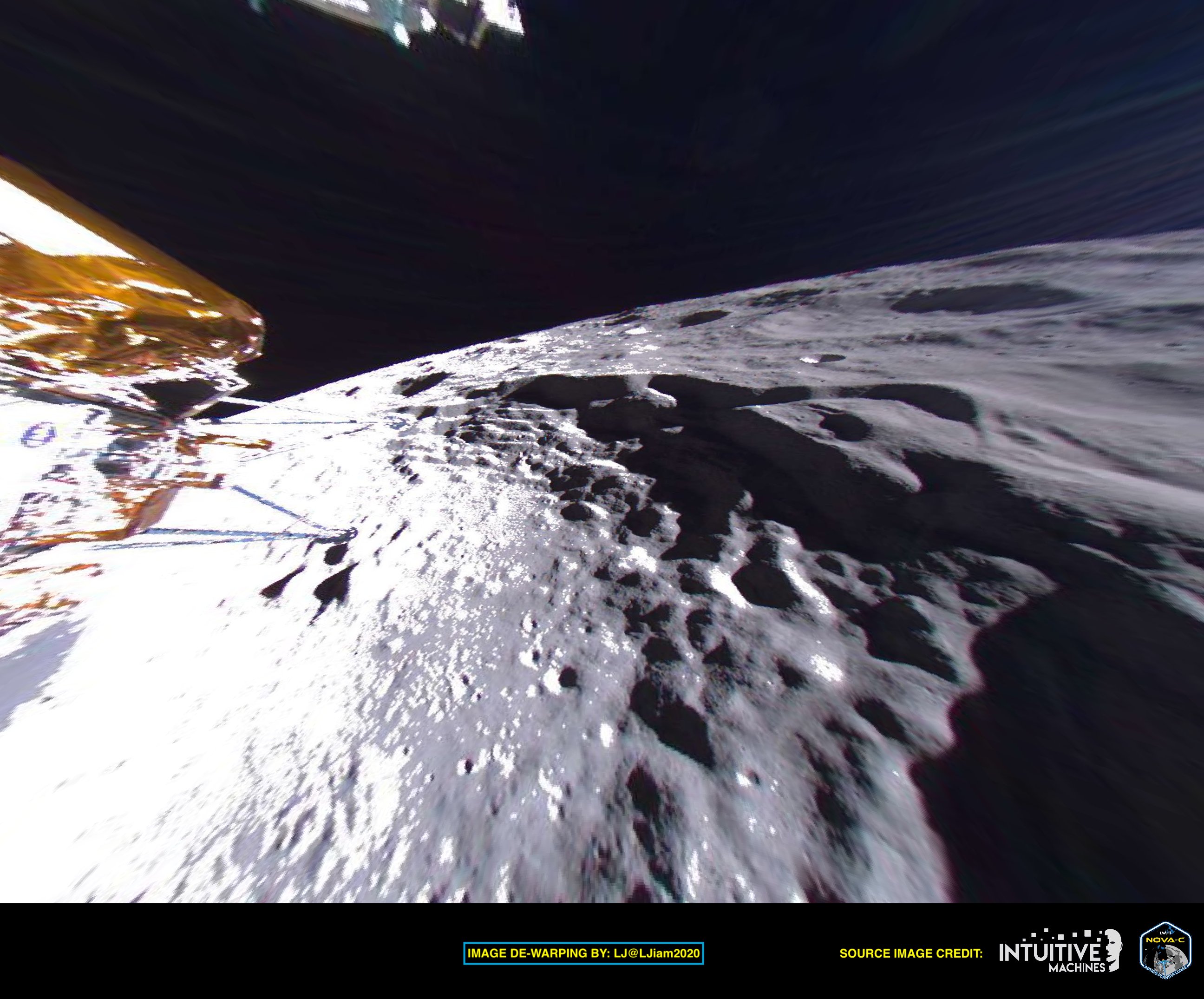 В обновленном сообщении, опубликованном 26 февраля, первом после брифинга 23 февраля, на котором компания сообщила, что лунный аппарат Nova-C, вероятно, опрокинулся во время посадки накануне, компания опубликовала снимок низкого разрешения, сделанный космическим аппаратом после посадки. На снимке видна часть аппарата и тень, которую он отбрасывает на поверхность, но мало других подробностей о состоянии и здоровье аппарата. Компания также опубликовала снимок, сделанный во время спуска аппарата.