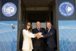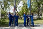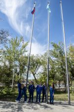 На площадке №17 космодрома Байконур перед зданием гостиницы «Космонавт» состоялась торжественная церемония поднятия флагов стран, участвующих в международном запуске транспортного пилотируемого корабля «Союз МС-19».