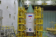 В субботу, 23 октября, на первом этапе работ проведена стыковка космической головной части (с «грузовиком» под створками обтекателя) с третьей ступенью ракеты-носителя «Союз-2.1а», затем эту сборку пристыковали к так называемому пакету носителя (первая и вторая ступени). По завершении механической сборки проведены электрические соединения и проверки собранной ракеты.