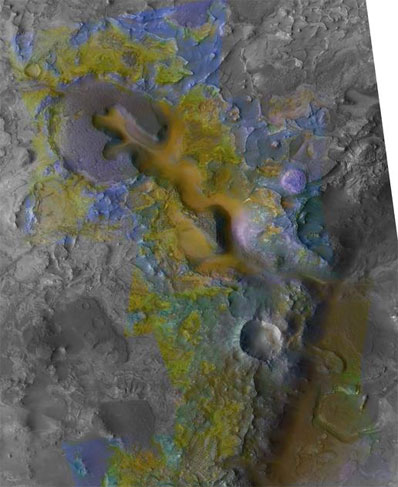 Carbonate, which is indicative of a wet and non-acidic history, occurs in very small patches of exposed rock appearing green in this color representation of an area about 12 miles wide on Mars. Credit: NASA/JPL/JHUAPL/MSSS/Brown University