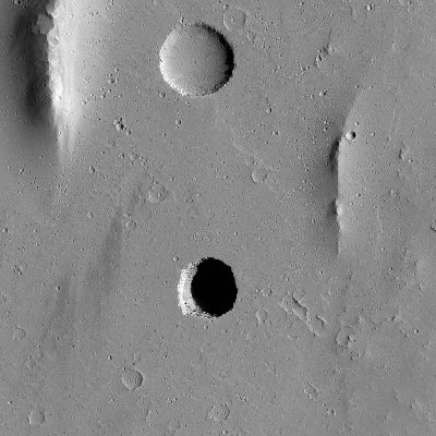 Еще одна загадочная деталь на Красной планете получила свое объяснение. Дыры на поверхности Марса, в которых черным-черно и про которые много уже было нафантазировано. Ученые однако уже давно высказывали предположение что это всего лишь обвалившиеся подземные пустоты, и в качестве примера приводили аналогичные объекты на Гаваях - Devil's Throat. 30 декабря 2008 года была сделана очередная фотография такого образования, а затем ученым удалось вытянуть изображение деталей дна - как видим ничего сверхъестественного. :roll:  последнее фото доступно в большем разрешении.