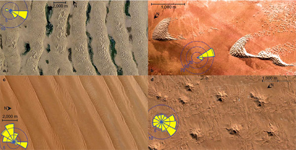 Рис. 1. Масштабы гигантских дюн для различных ветровых режимов: a — поперечные дюны пустыни Бадын-Джаран (Китай), b — дюны в форме полумесяца Атлантической Сахары (Марокко), с — продольные дюны пустыни Руб-эль-Хали (юго-восточная часть Аравийского полуострова), d — звездообразные дюны пустыни Большой Восточный Эрг (Grand Erg Oriental) в Алжире. Желтыми секторами показаны преобладающие направления ветров в пустыне. Снимки из обсуждаемой статьи в Nature