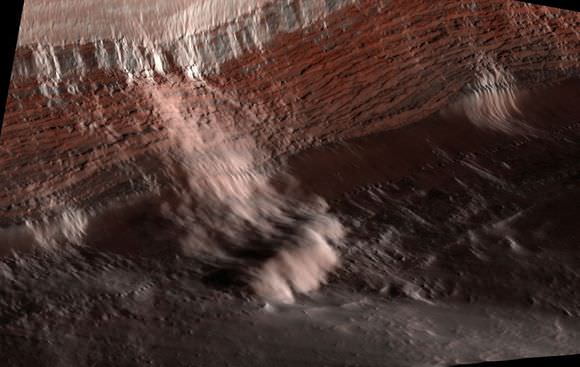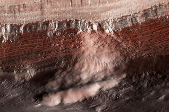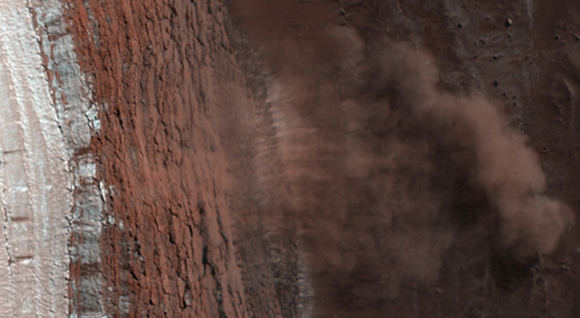 В 2008 с помощью камеры HiRISE на борту Mars Reconnaissance Orbiter удалось заснять сход лавины с откоса высотой более 700м и уклоном более 60 град. На снимке видно как масса льда и скальных обломков мчится вниз по склону, ко дну утеса, вздымая облако пыли шириной более 180м: