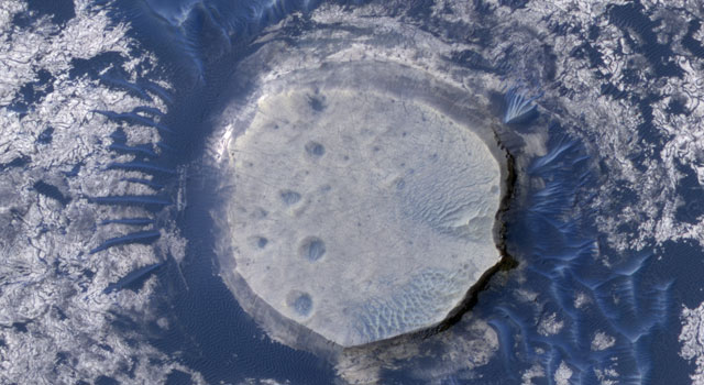 В марсианском кратере, расположенном в северном полушарии планеты, обнаружен водяной лед. Снимок кратера в высоком разрешении, а также его описание доступны на портале Space.com.