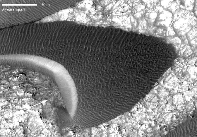 For years, researchers debated whether sand dunes observed on Mars were mostly fossil features related to past climate, rather than currently active. In the past two years, researchers using images from Mars Reconnaissance Orbiter's High Resolution Imaging Science Experiment (HiRISE) camera have detected and reported sand movement.