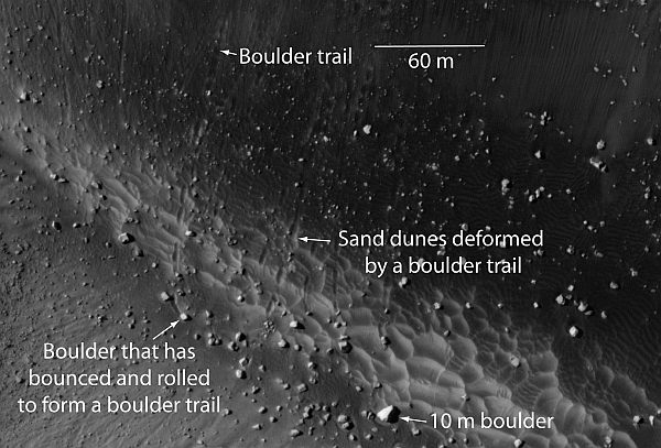 С помощью камеры высокого разрешения HiRISE (High Resolution Imaging Science Experiment) Джералд Робертс из Лондонского университета исследовал валуны размером от двух до 20 метров вдоль системы разломов Борозды Цербера (Cerberus Fossae), которая пересекает относительно молодую - возрастом несколько миллионов лет - лавовую равнину.