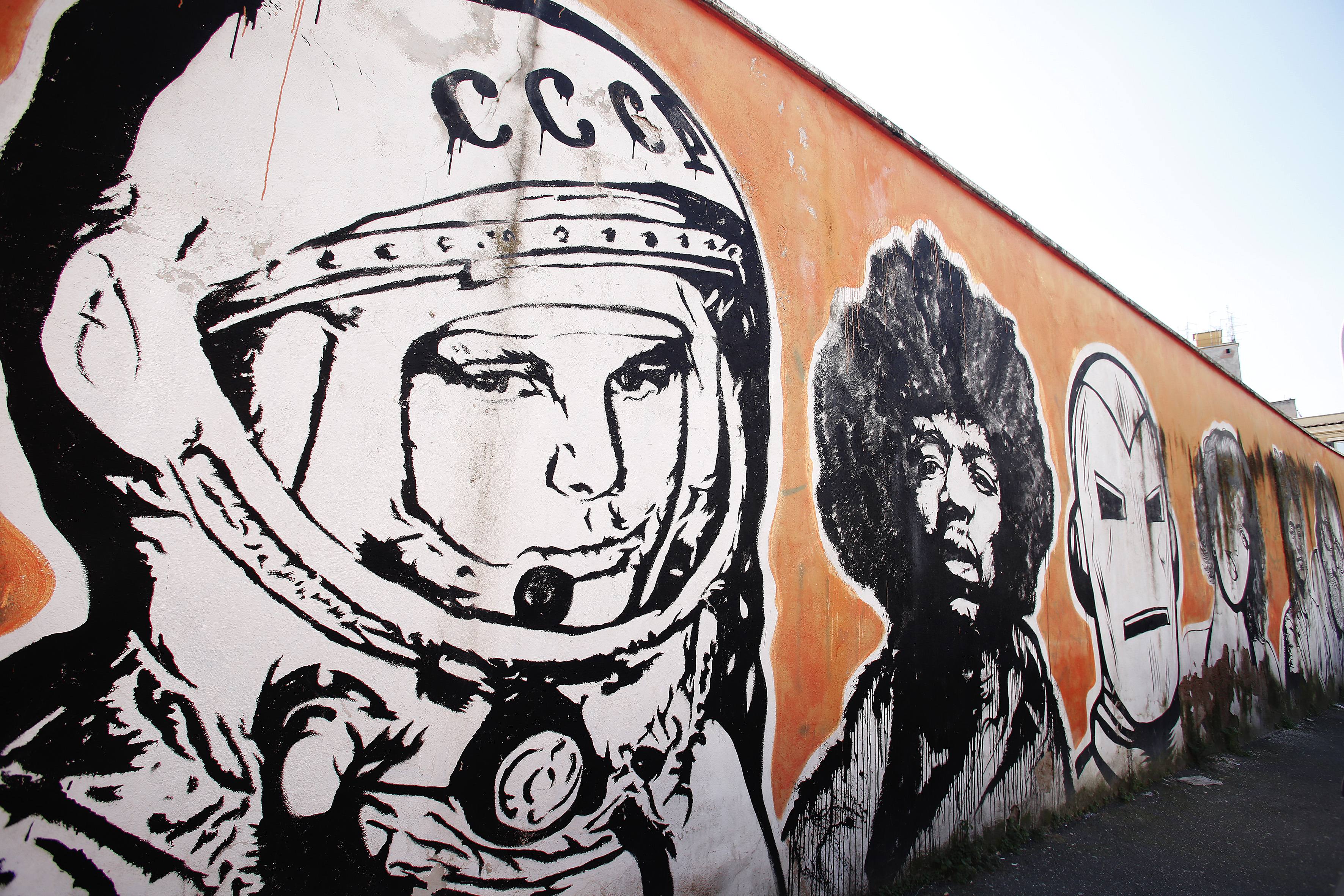 Космонавт часто бывает героем стрит-арта, но самое большое в России граффити появилось на стене жилого высотного дома в подмосковном Одинцове в 2019 году. Картину высотой 60 метров нарисовал итальянский уличный художник Йорит Агоч. На ней изображено лицо Гагарина с узором на лице как у Зигги Стардаста (персонажа песен Дэвида Боуи).