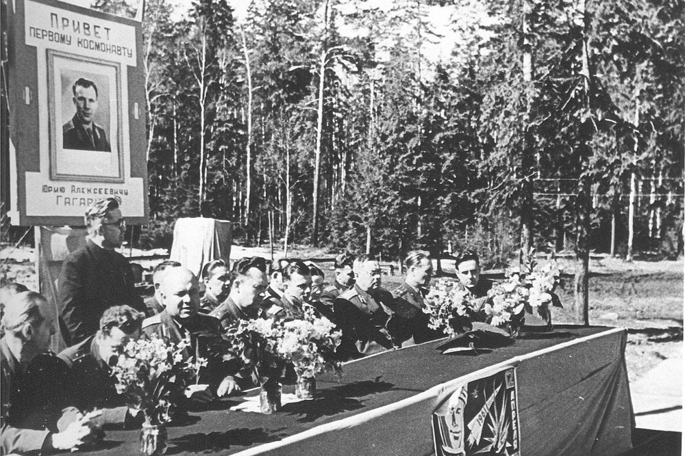 Редчайшее фото. Примерно 16 апреля 1961 года. Чествование первого космонавта Ю.А. Гагарина в ещё не построенном ЦПК. Слева направо: сотрудник ЦПК, Герман Титов (спрятался за цветами), замполит ЦПК Никирясов, первый начальник ЦПК Е.А. Карпов, Ю.А. Гагарин, рядом Валентина Ивановна Гагарина, крайний справа в первом ряду Владимир Комаров Фото: Из личного архива Владимира Щербинского