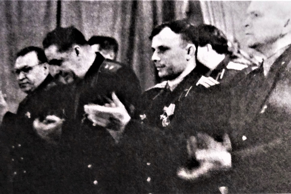 Ю.А. Гагарин на торжественном собрании в ГНИИИ А и К М, посвящённом первому полёту человека в космос. 15.04.1961 г. Слева направо: зам. начальника института, генерал-лейтенант мед. службы Клоков В.Я., начальник института. генерал-лейтенант мед. службы Волынкин Ю.М., майор Гагарин Ю.А., начальник космического направления, полковник мед. службы Яздовский В.И. Фото: Из личного архива Владимира Щербинского