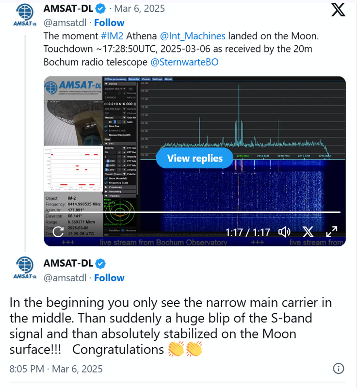 ЦитироватьAthena is on the lunar  surface - things are working. They may let images come down early. They had multi path issues I.e. radio waves taking multiple paths bouncing off of mountains and craters and possibly confusing things a bit. This was expected in places such as the lunar South Pole