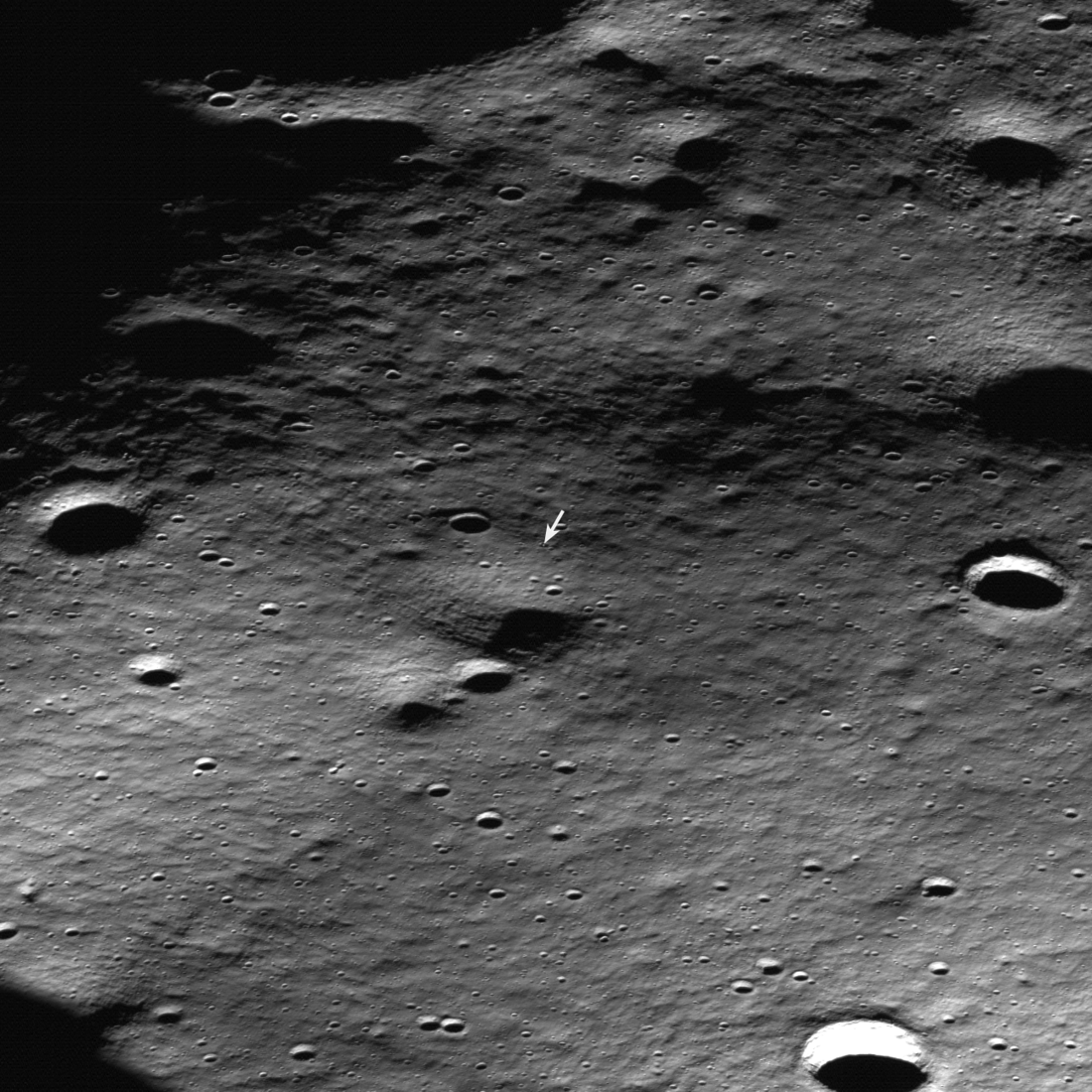 Посадочный аппарат IM-2 Athena коснулся поверхности быстрее, чем предполагалось, и оказался на боку в кратере диаметром 20 метров (84,7906° ю.ш., 29,1957° в.д.). Однако аппарат функционировал на поверхности и передал более 400 Мбайт данных. Север - справа, ширина изображения 2 км, полное разрешение, NAC M1495922531LR [NASA/GSFC/Университет штата Аризона].