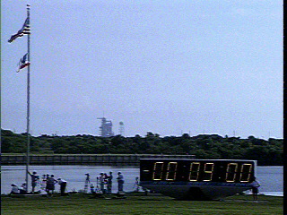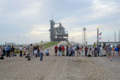 Автобус с астронавтами проехал мимо VAB (Vehicle Assembly Building - то большое белое здание с американским флагом и эмблемой НАСА, которое чаще всего показывают в репортажах из KSC). Несколько журналистов и репортеров выходят помахать астронавтам, несмотря на непогоду. Это традиционное пожелание удачи экипажу.