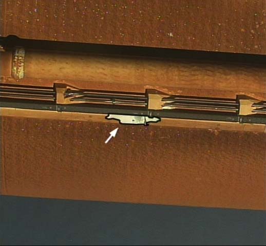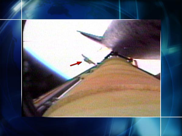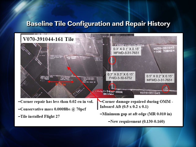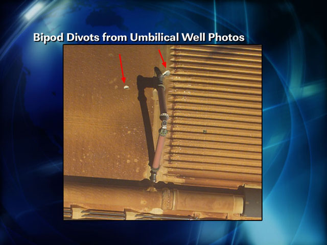 Насколько я понимаю основное внимание было уделено узлу крепления корабля, то есть тому месту откуда в случае с Колумбией и оторвался кусок пены. А на этом снимке видно - отвалился кусманчик длиной около метра как раз под днищем шаттла. Удар, если он и был пришёлся в кормовую часть теплозащиты. С манипулятора эти места ещё не осматривали. Так что предлагаю подождать до выходов экипажа...