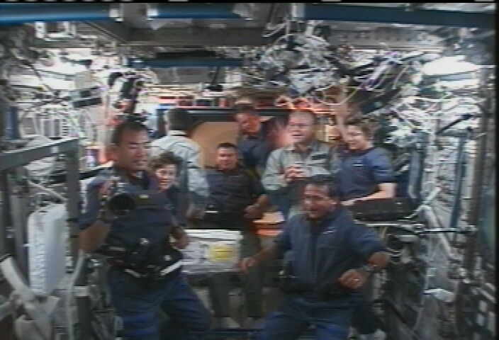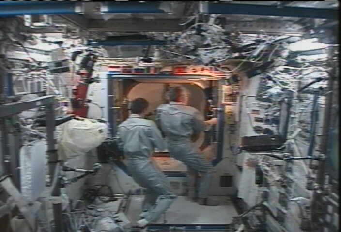 16:55 MSD, после нескольких минут фотографирования друг друга через шлюзовой коридор, экипаж челнока Дискавери переходит в модуль Дестини