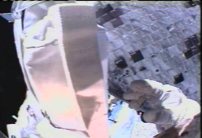 Robinson gently holds the second protruding gap filler with his spacesuited thumb and finger.