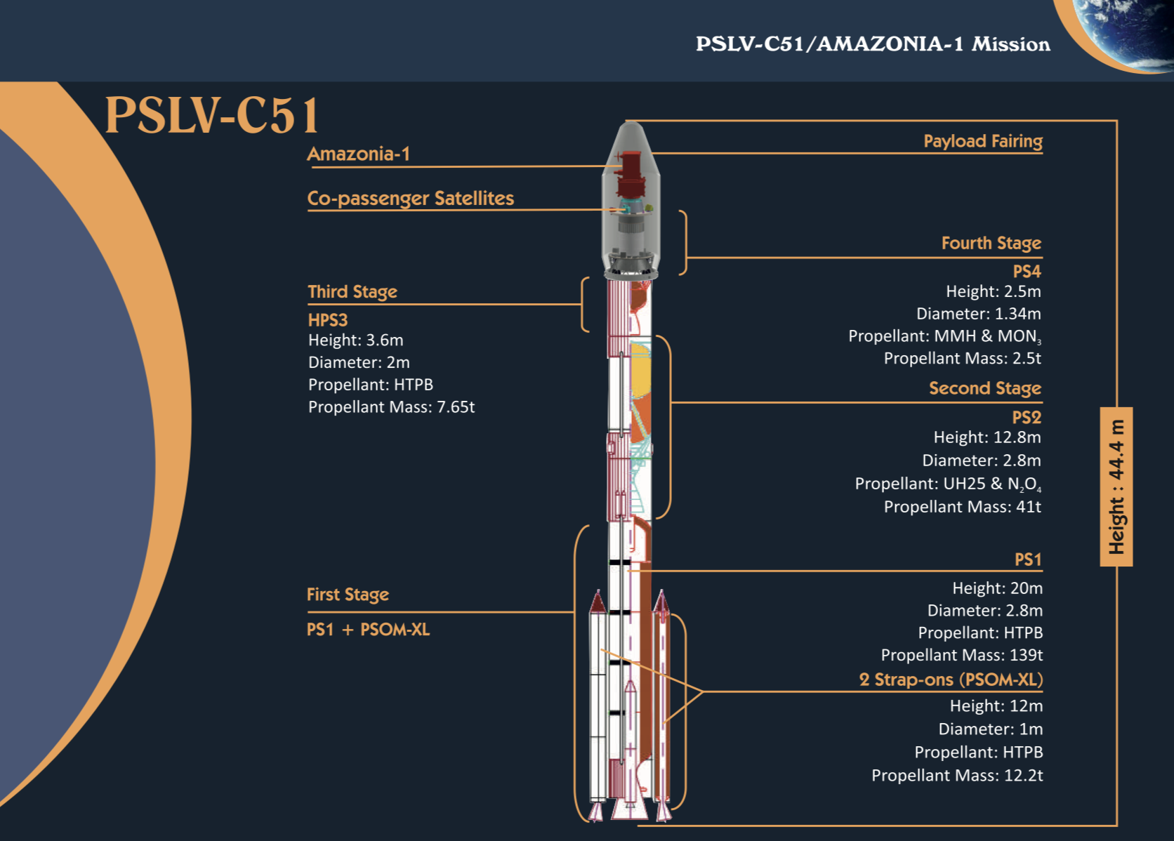 The PSLV's fourth stage will deploy Amazonia 1 into its 467-mile-high orbit about 17 minutes after liftoff, then reignite its thrusters for two burns to lower its altitude to 317 miles (511 kilometers) for release of the other 18 payloads nearly two hours into the mission.