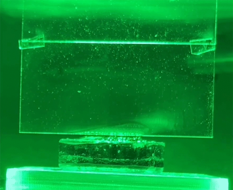 Клубы светлого конденсата на стекле — это испарение воды из гидрогеля под действием зеленого света без нагрева / © Yaodong Tu, MIT