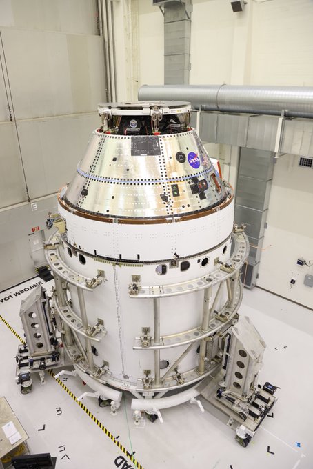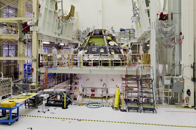 installed the three spacecraft adapter jettison fairings that encapsulate Orion's service module, the last step before Orion is fueled and prepared for stacking on @NASA_SLS.