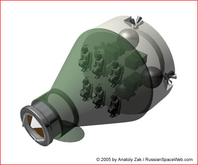 In addition to the heavy-lift launch-vehicle, Khrunichev concurrently proposed a new manned spacecraft, loosely based on the company's long-lasting TKS family of space tugs and modules. A partially reusable vehicle could carry up to 6 people -- not coincidentally a full crew of the International Space Station -- but also clearly featured capabilities for deep-space missions. The spacecraft, would put Khrunichev on a collision course with its old-time rival -- RKK Energia -- which earlier proposed Kliper spacecraft with similar capabilities.