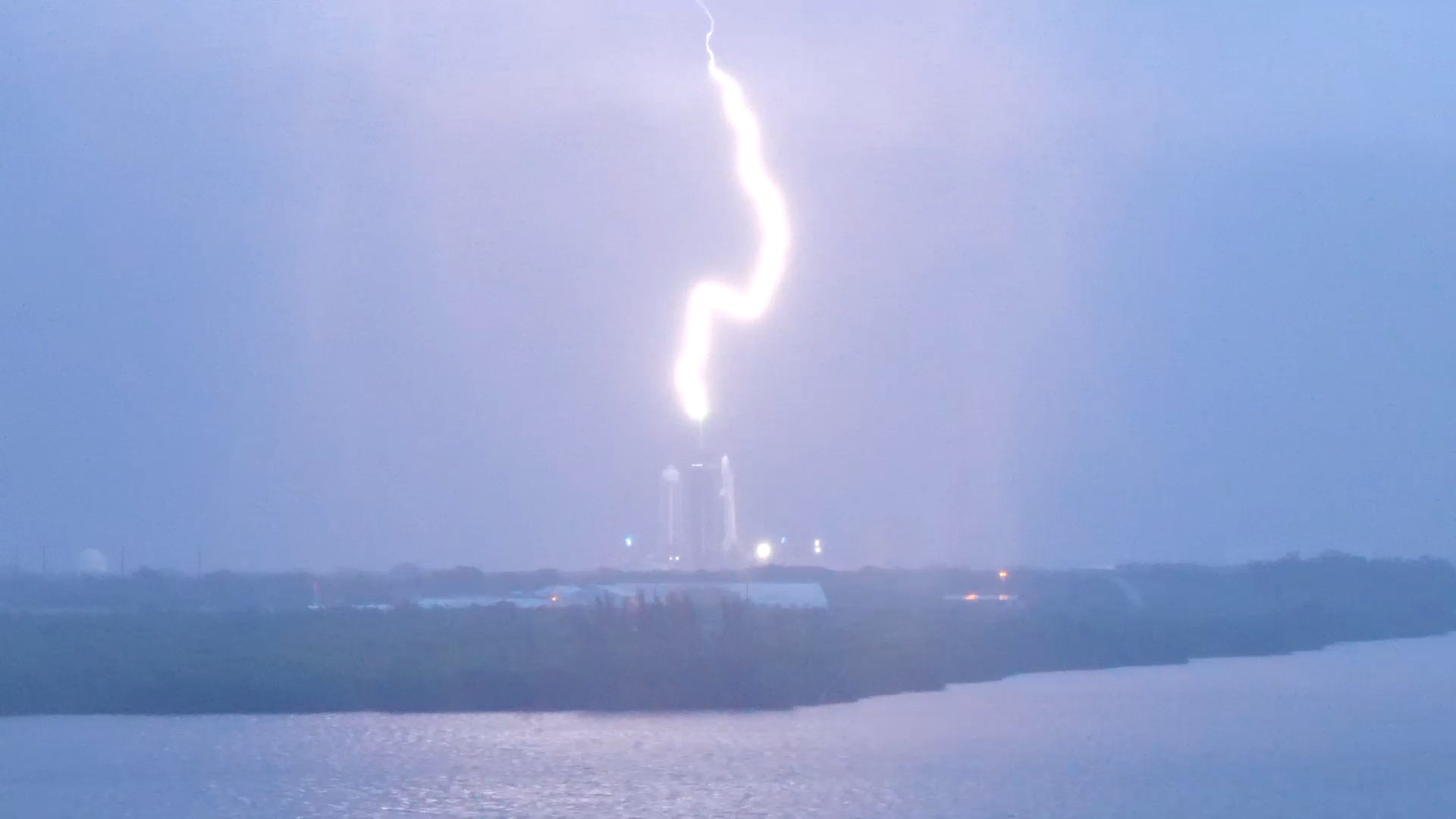 Pad 39A, where the Falcon Heavy was awaiting launch, just took a strike to its lightning mast. The bad weather has delayed the launch at least 24 hours.