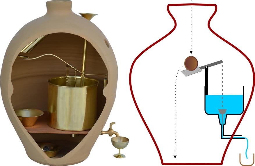 Принцип, по которому работает торговый автомат Герона, довольно прост: монета приземлялась на своего рода весы, и склоняла одну чашу, тем самым поднимая другую, к которой был закреплен клапан для воды. Клапан был открыт, пока монета соскальзывала со своей чаши весов. Поэтому порции воды могли немного отличаться по объему, в зависимости от того, насколько удачно упадет монета, а также от количества оставшейся воды в резервуаре.