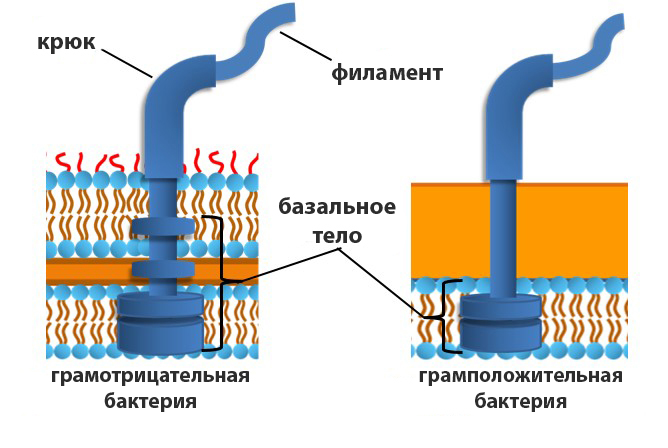 Филамент жгутика – это относительно жесткая белковая спираль, закрученная против часовой стрелки с образованием центрального полого канала диаметром до 3 нм. Такая конструкция способствует формированию спиральной траектории движения нити. По каналу филамента транспортируются молекулы флагеллина (FliC). Крюк соединяет нить с базальным телом жгутика и состоит из двух типов белка: FlgE и FlgKl. Длина сочленения постоянна и составляет около 50 нм. Из-за изогнутой формы крюка при вращении мотора основание фибриллы описывает круг, благодаря чему возможно спиралевидное движение жгутика. Базальное тельце закреплено в клеточной стенке и цитоплазматической мембране бактерий. Эта субструктура выполняет не только фиксирующую функцию, но и является мотором жгутика. Строение и локализация базального тельца зависят от типа клеточной стенки микроорганизма. У грамотрицательных бактерий оно состоит из двух внутренних (M и S) и двух внешних (P и L) колец, нанизанных на соединенный с крюком стержень. В состав базального тела также входит экспортная система, транспортирующая белковые элементы для сборки жгутика.