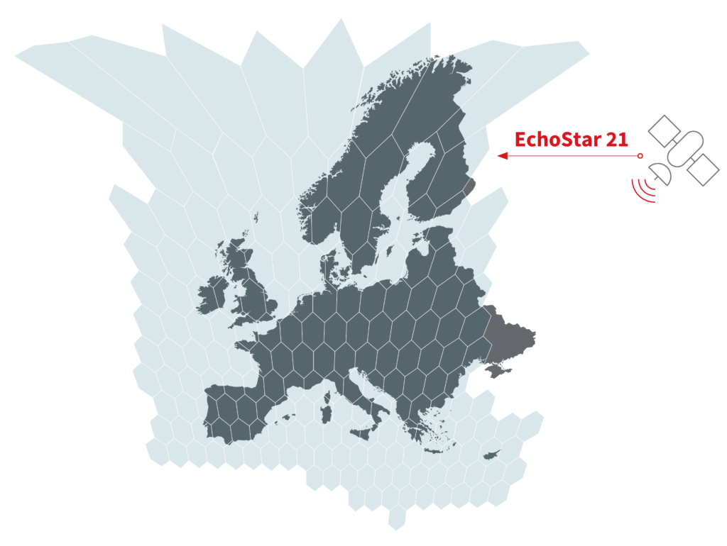 Над Европой здесь показана зона спутника Эхостар-21 в диапазоне S в точке около 11 в.д. Там много узких лучей и возможность работать напрямую на смартфон.