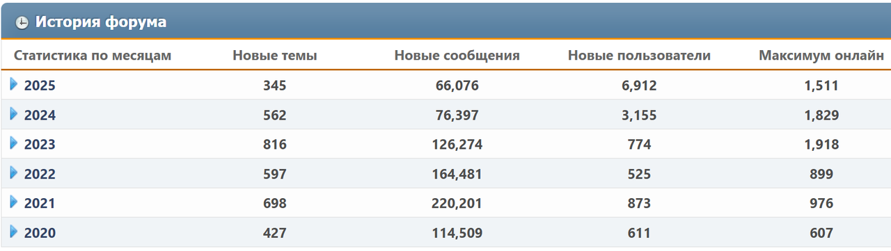Цитата: zandr от 21.08.2025 21:51:06В Статистике форума внизу можно увидеть прибавку (с обновления в 2020 году) по годам, месяцам и даже дням.
