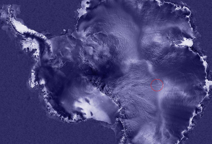 Озеро Восток (показано кружком) — далеко не единственное подлёдное озеро в Антарктиде, их там почти полторы сотни, но оно — крупнейшее. А ещё на этом континенте существуют и скрытые реки (фото NASA GSFC)
