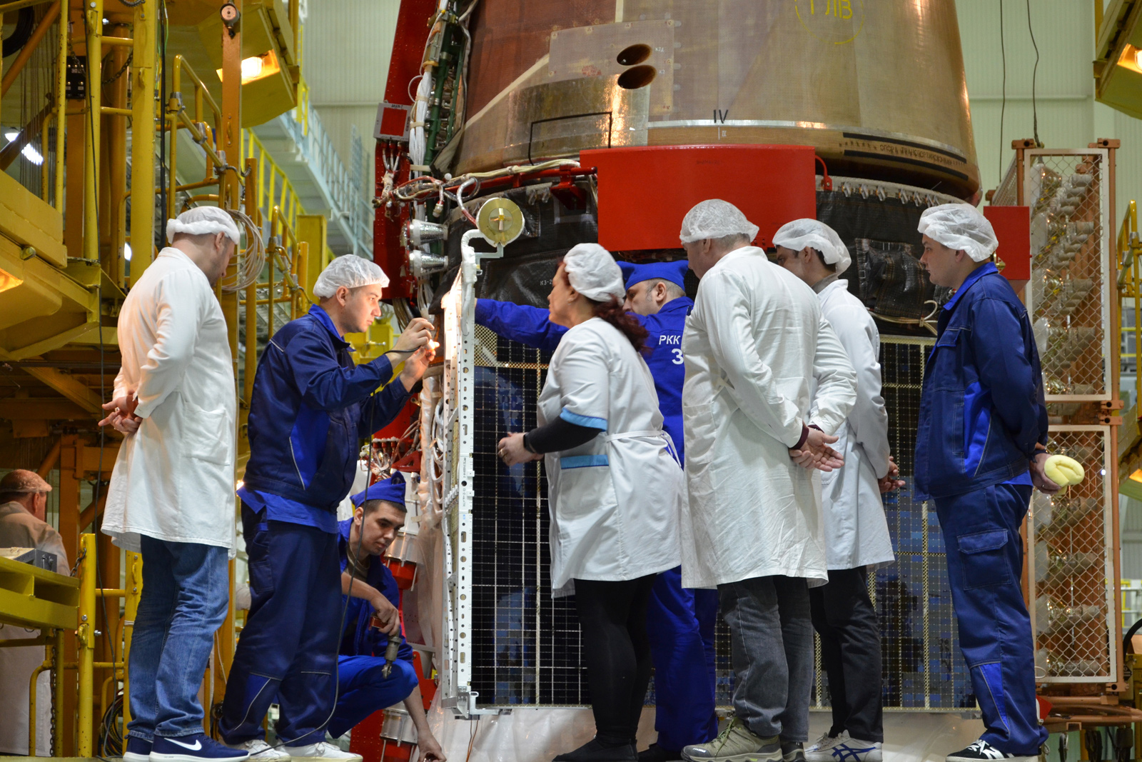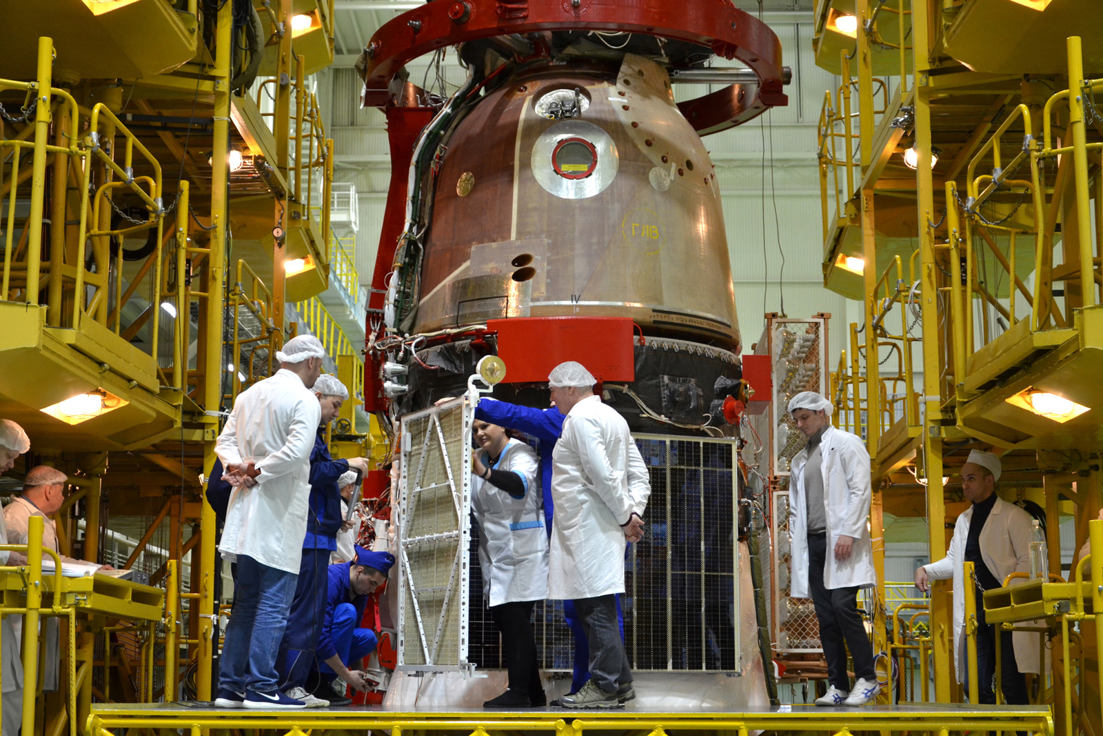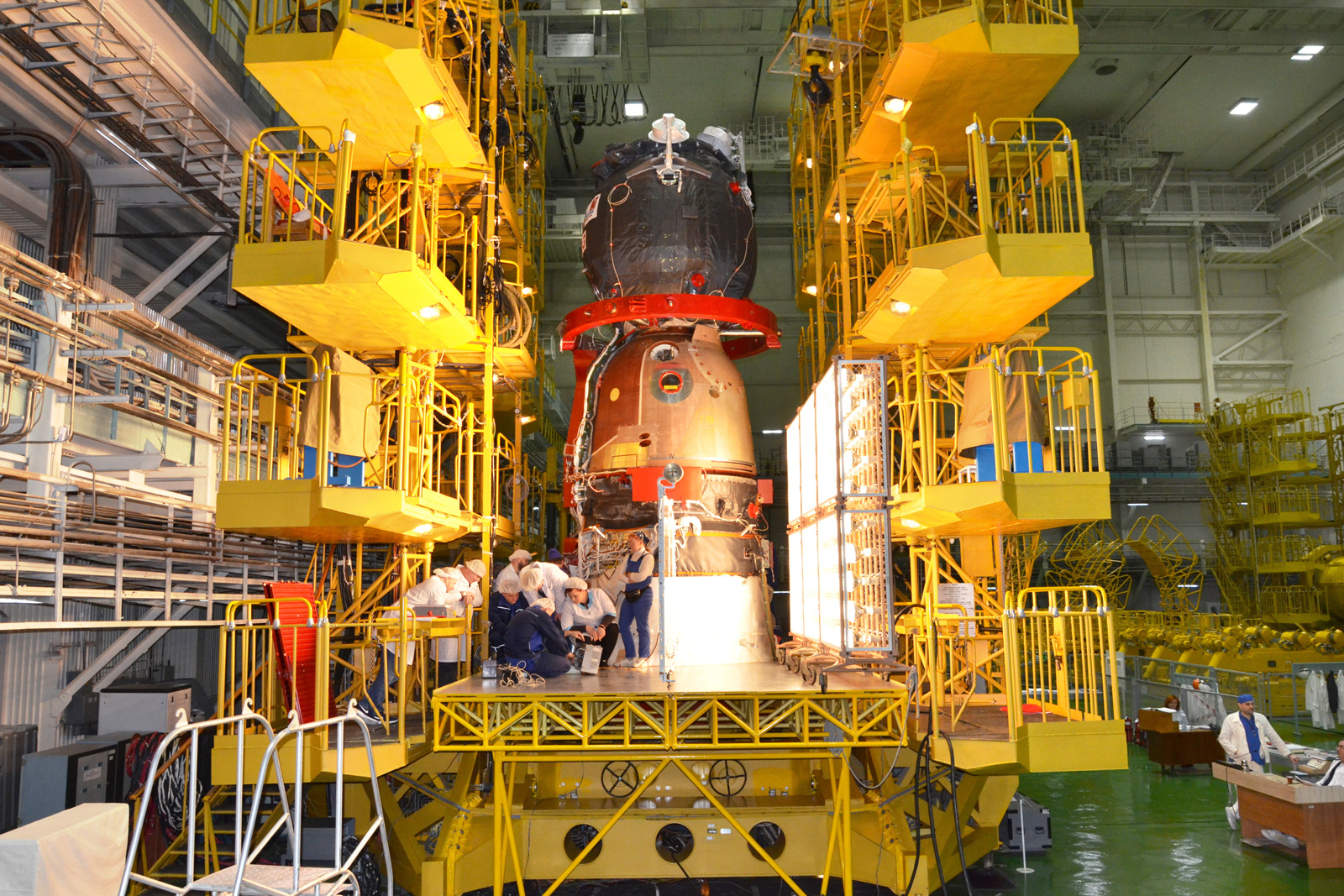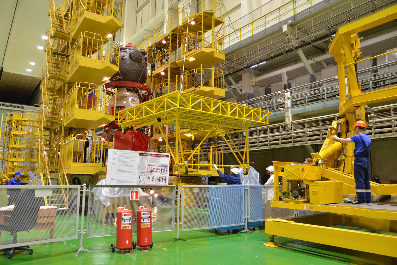 В монтажно-испытательном корпусе площадки 254 космодрома Байконур продолжается заключительный этап предполетной подготовки транспортного пилотируемого корабля «Союз МС-25»