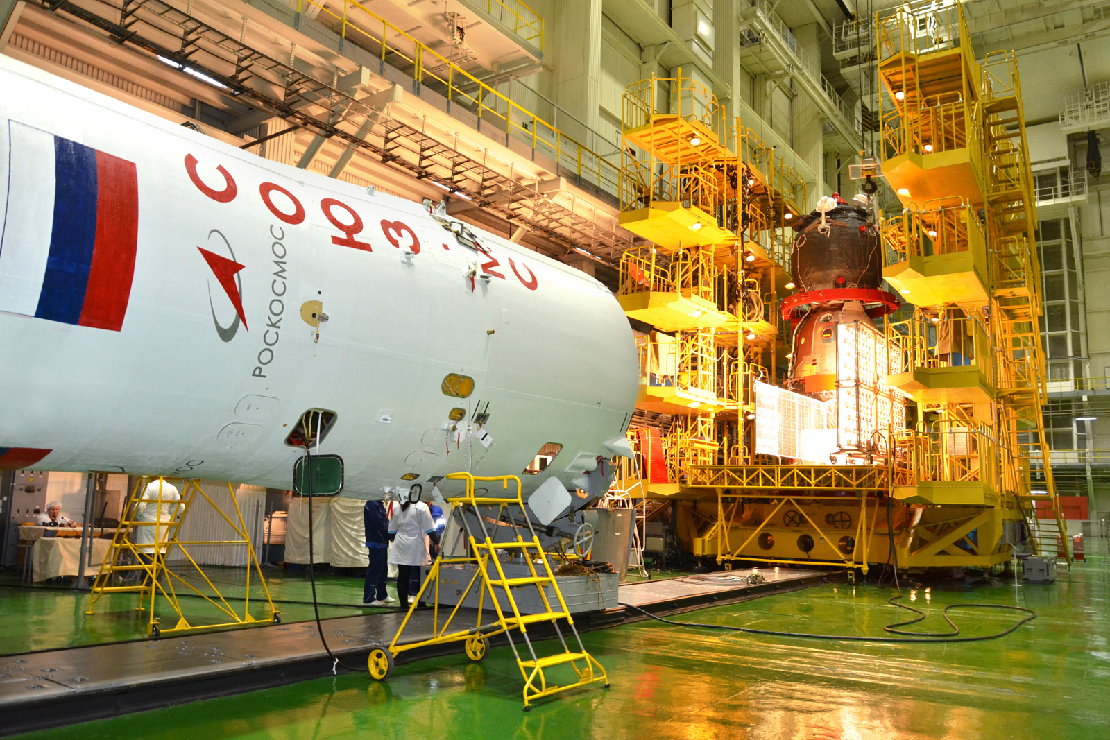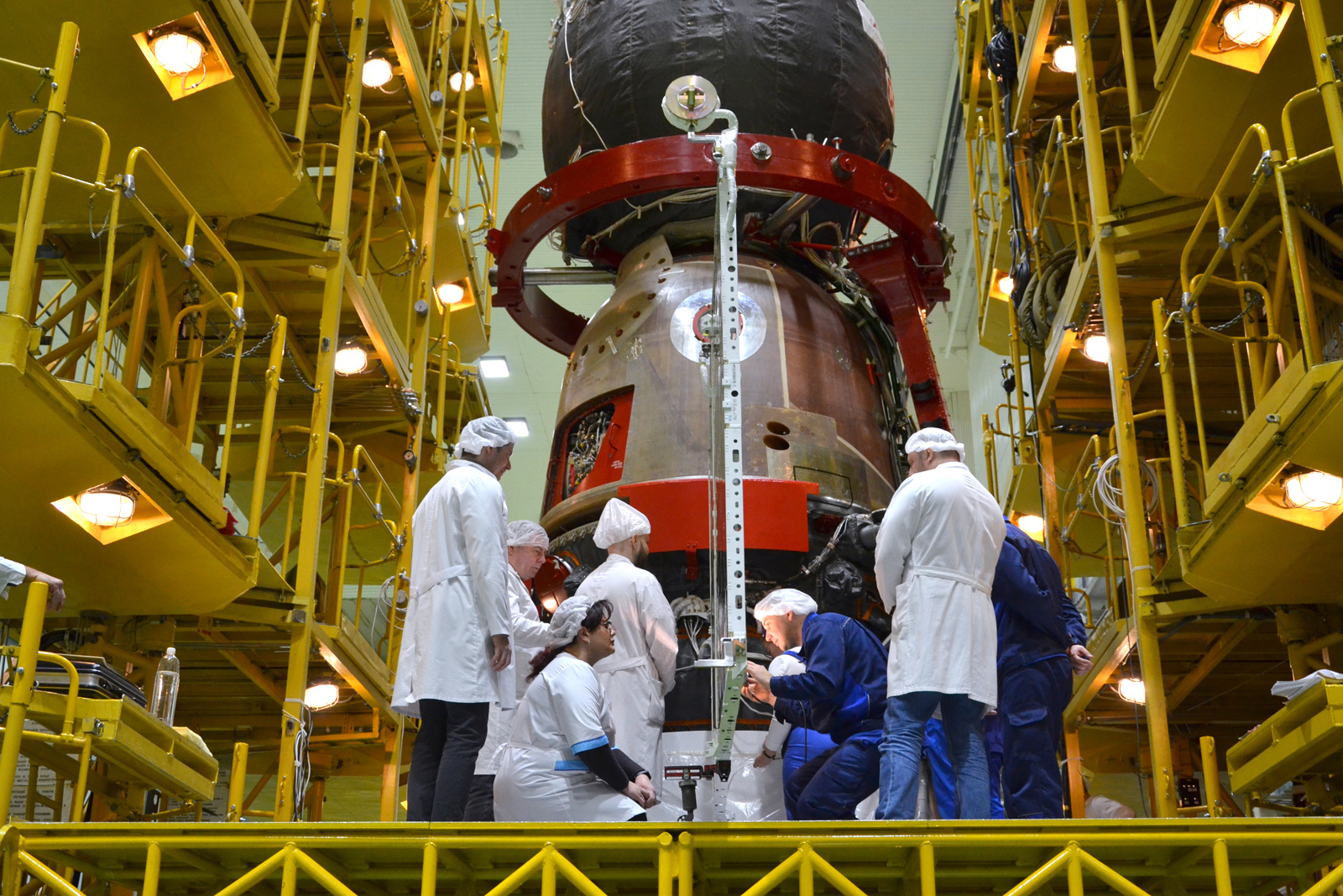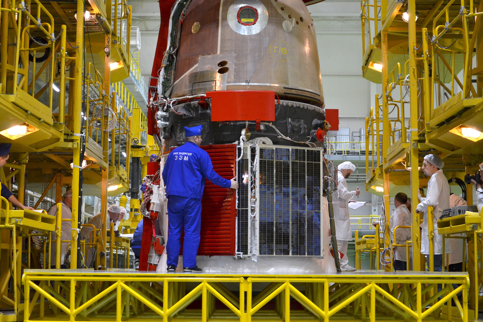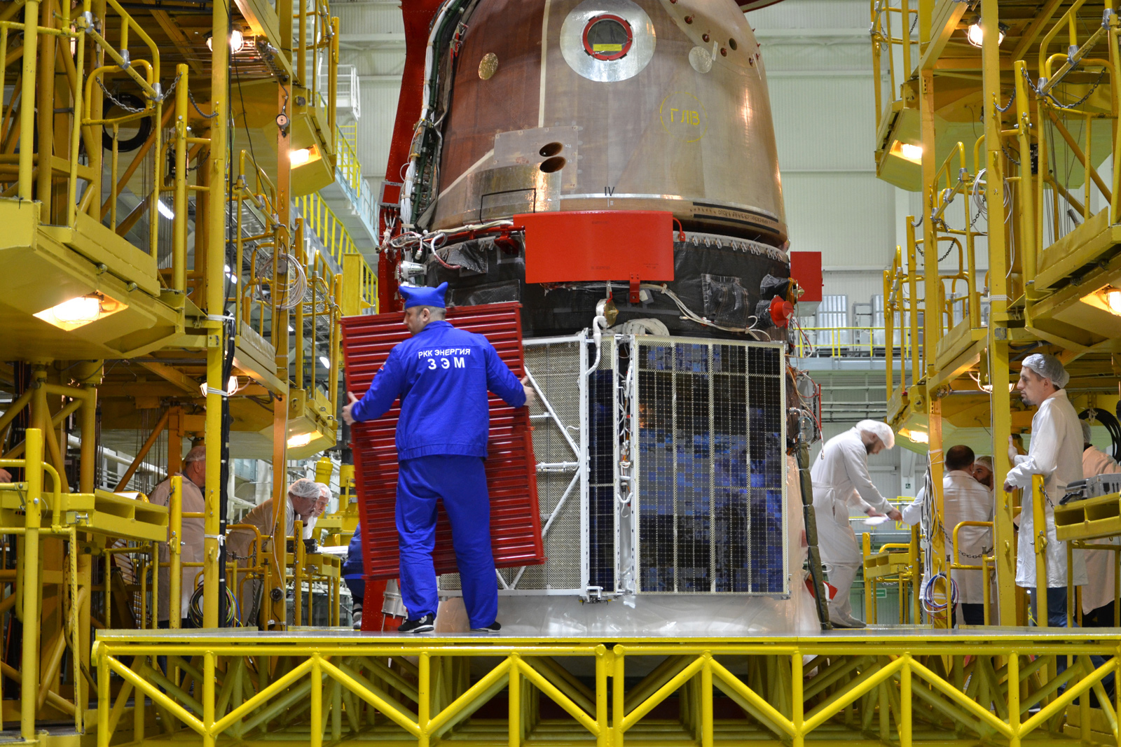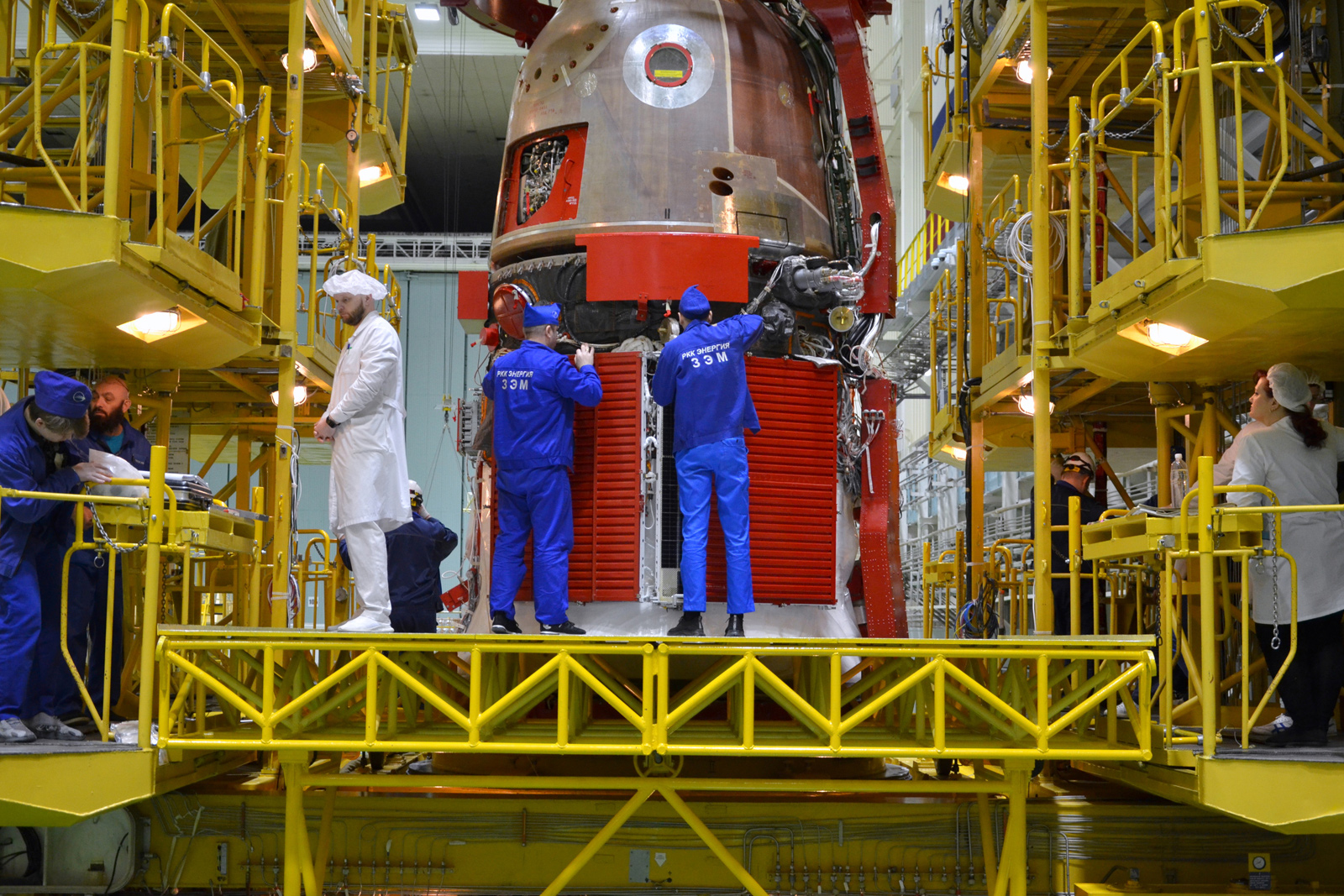В монтажно-испытательном корпусе площадки 254 космодрома Байконур продолжается заключительный этап предполетной подготовки транспортного пилотируемого корабля «Союз МС-25»
