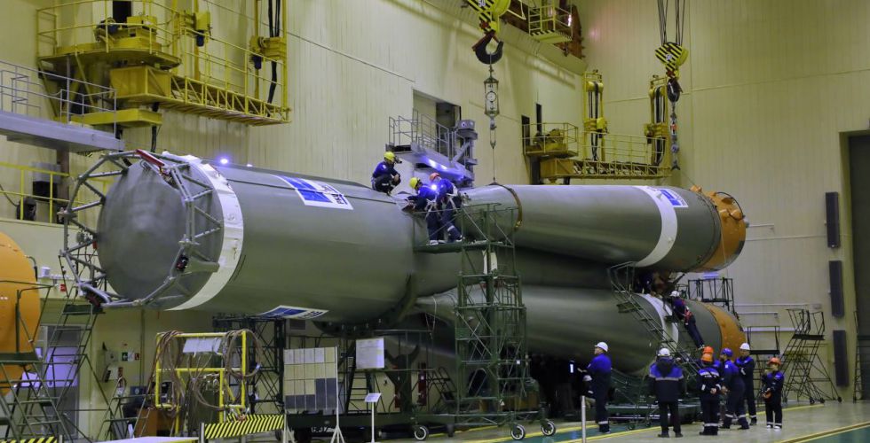 Проведена механическая сборка «пакета» ракеты-носителя: к центральному блоку (вторая ступень) присоединены четыре боковых блока (первая ступень). После завершения сборочных операций «пакет» переложат на место хранения в монтажно-испытательном корпусе 31-й площадки космодрома.