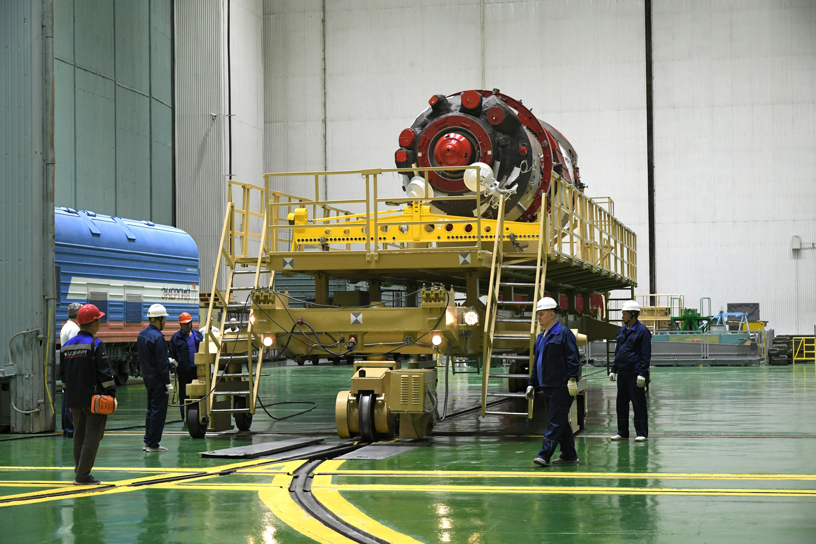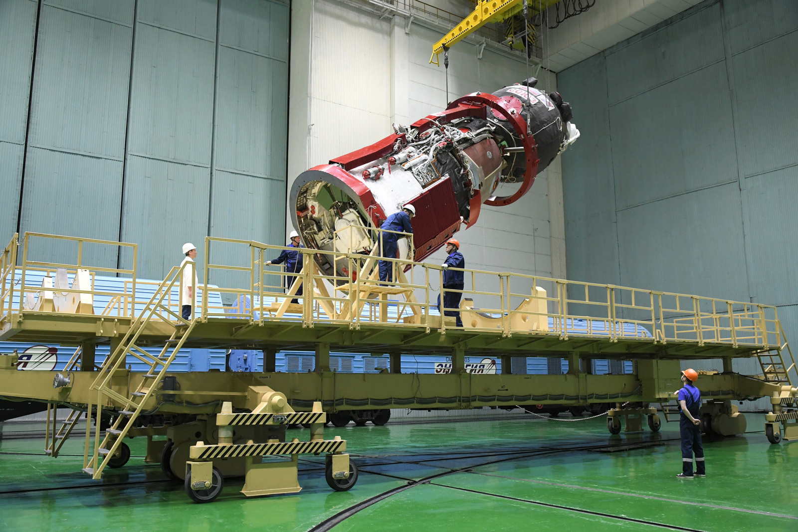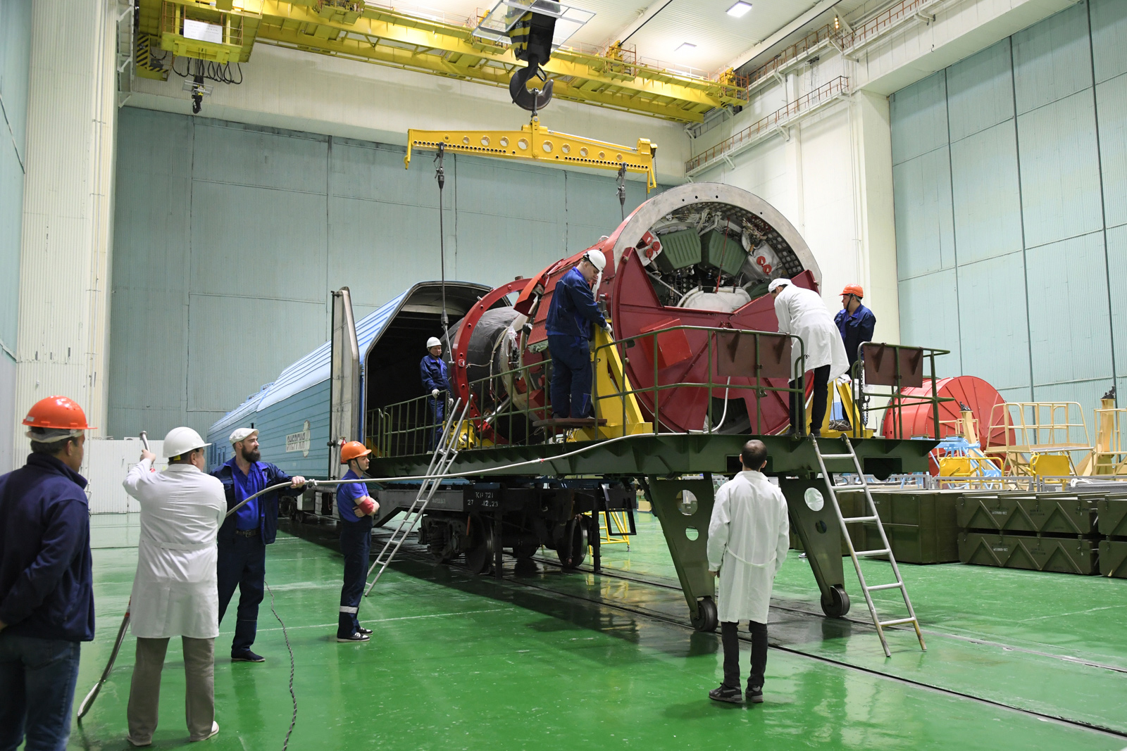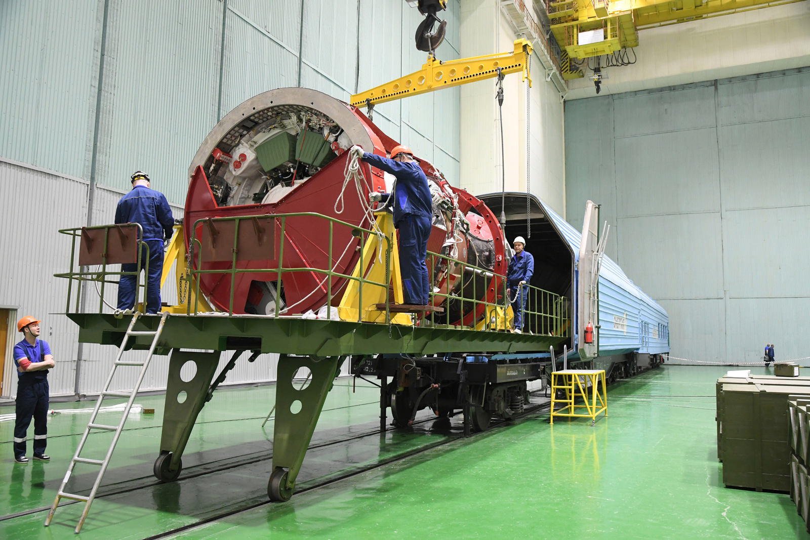 Специалисты Роскосмоса выполнили комплекс технологических операций по погрузке и отправке корабля в монтажно-испытательный корпус 31-й площадки, где провели подготовку головного блока к сборке ракеты «Союз-2.1а».