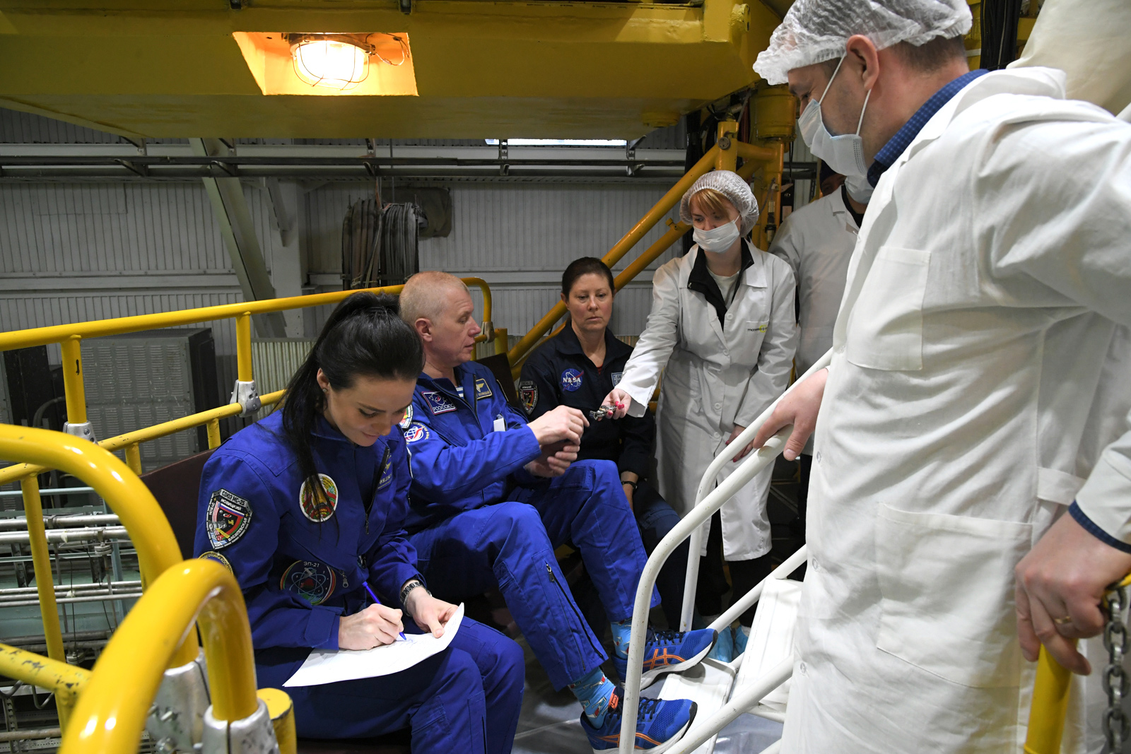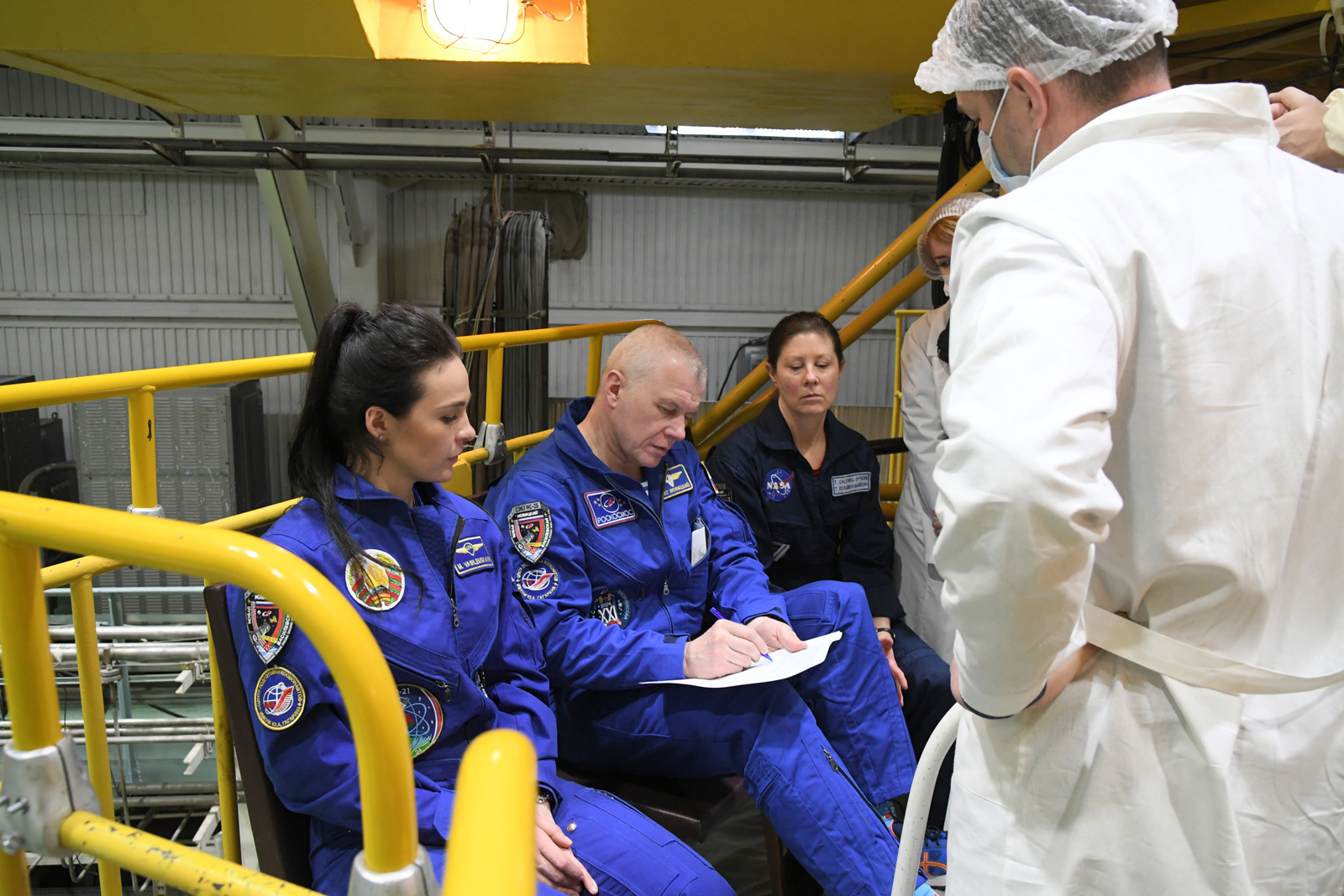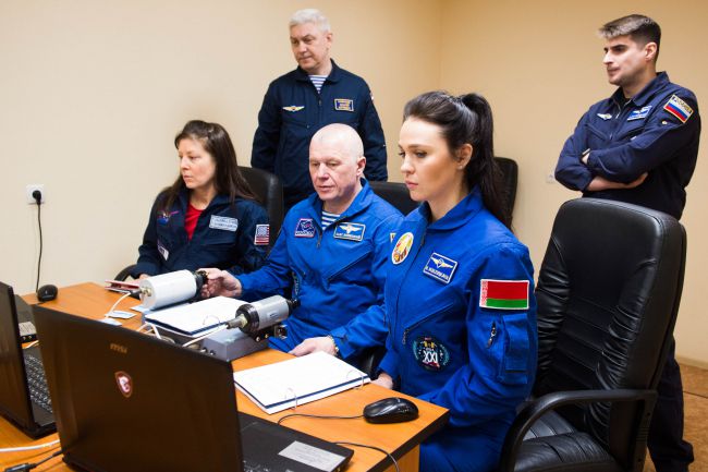 По завершении вводного инструктажа экипажи поочередно заняли свои места в корабле, проверили размещаемое снаряжение и доставляемые грузы в спускаемом аппарате и бытовом отсеке, в тестовом режиме убедились в работоспособности бортовых систем.