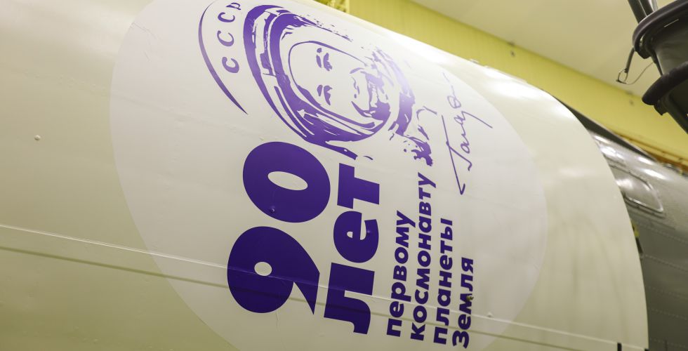 На головной обтекатель ракеты космического назначения нанесено изображение, посвященное 90-летию первого космонавта Земли Юрия Гагарина.