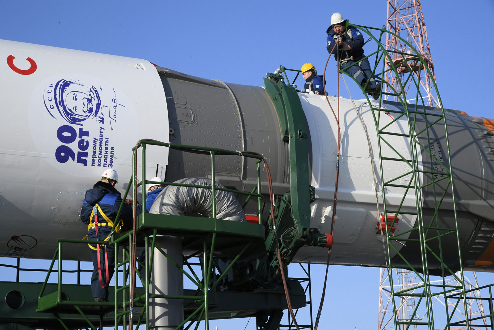 Фермы обслуживания сведены, теперь специалистам предстоит начать работы по графику первого стартового дня. На вывезенную ракету нанесено изображение, посвященное 90-летию со дня рождения первого космонавта Юрия Гагарина.