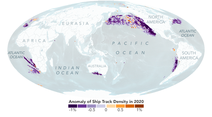 ▲ Отклонения плотности судовых следов в 2020 году. Согласно новому исследованию NASA, в 2020 году количество судовых следов значительно сократилось из-за нового морского топливного регламента и пандемии COVID-19.