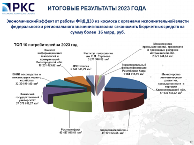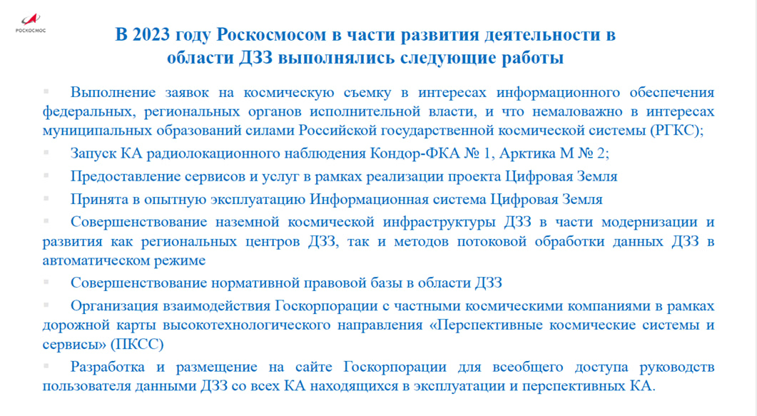 В 2024 году предстоит большая работа и прежде всего по выполнению поручений Президента Российской Федерации и Правительства Российской Федерации в части коммерциализации деятельности в области ДЗЗ из космоса, предоставлению потребителям космических сервисов и услуг ДЗЗ, мероприятия по выполнению которых должны быть включены в Национальный проект по космической деятельности Российской Федерации.