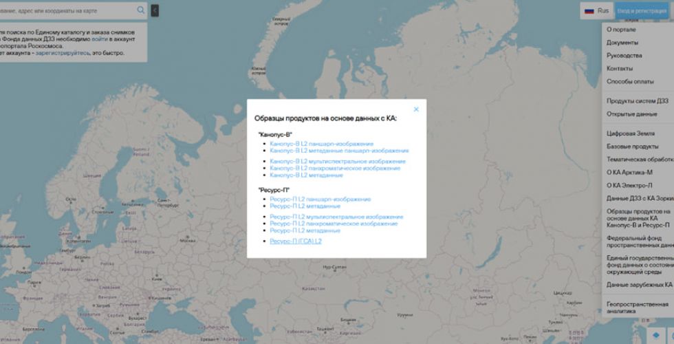 Образцы данных можно скачать на Геопортале Роскосмоса в развертываемом меню (располагается на кнопке с тремя горизонтальными линиями) во вкладке "Образцы продуктов на основе данных КА «Канопус-В» и «Ресурс-П»".