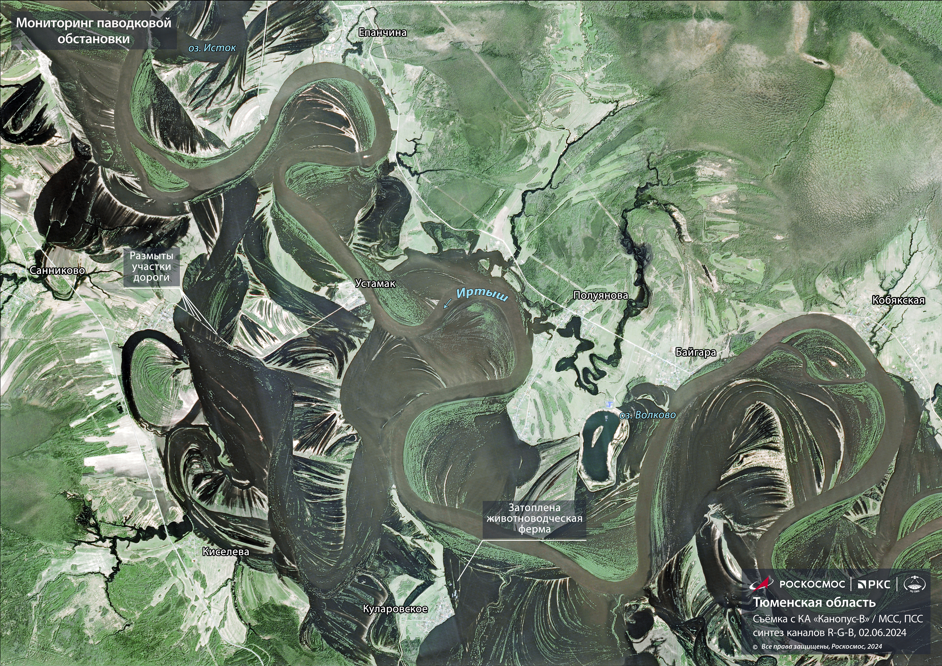 На изображении спутника «Канопус-В» высокая вода в Иртыше в Вагайском и Тобольском районах Тюменской области сохраняется, наблюдается размытие участков дороги Томилова-Устамак и затопление животноводческой фермы у посёлка Куларовское.