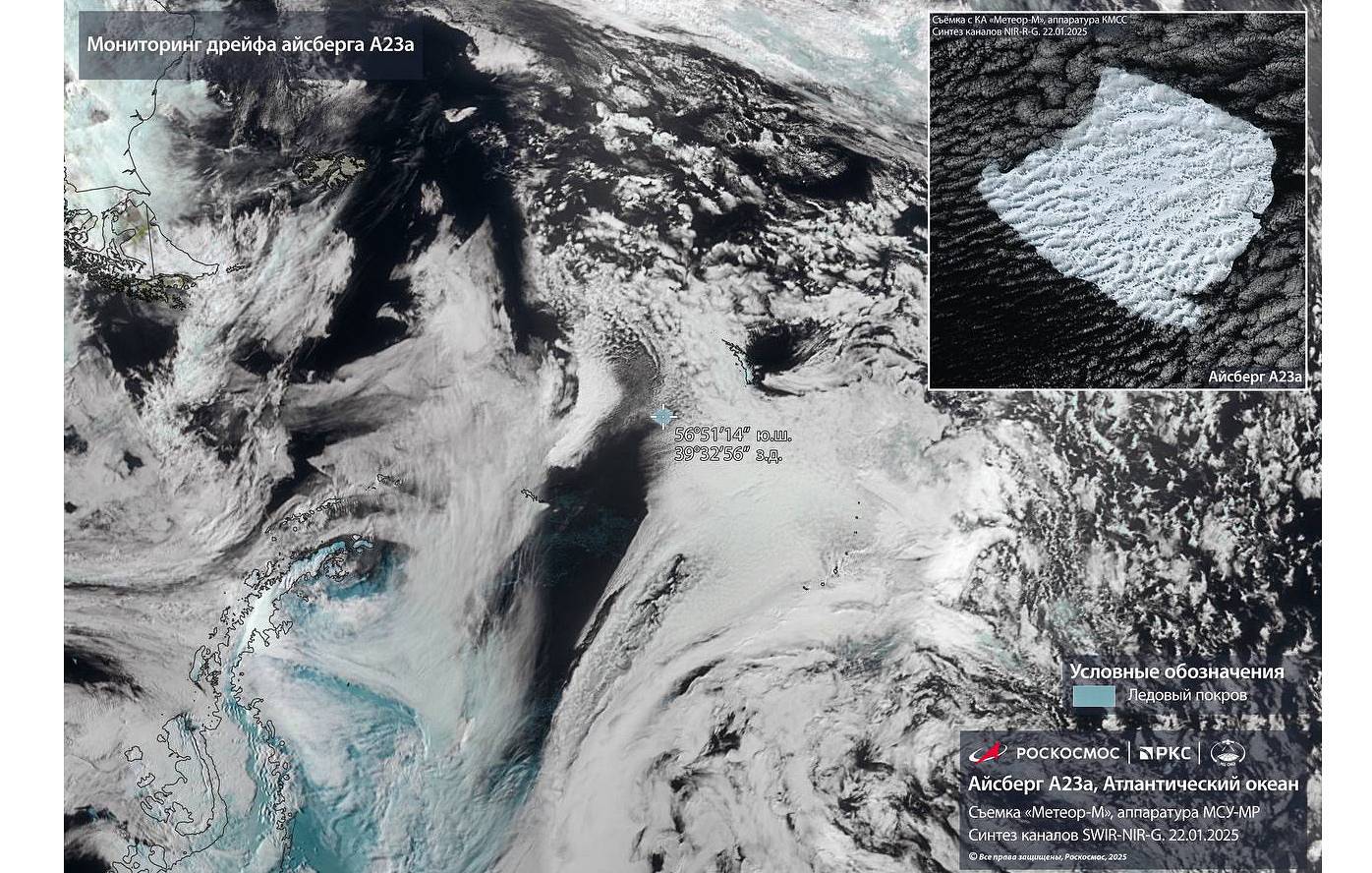 МОСКВА, 25 января. /ТАСС/. Роскосмос опубликовал снимок крупнейшего в мире айсберга А23а "Метеора - М".
