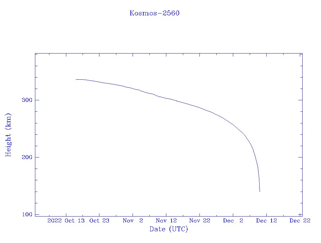 The Russian military sat Kosmos-2560, launched in October, reentered on Dec 10 at 0154 UTC over Guam. Like the previous satellite it the series, it performed no orbit raising burns.