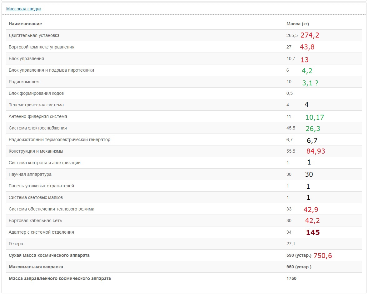 А это вопрос к НПОЛ. Я просто сравнил старую массовую сводку из Вестника НПО им. Лавочкина и более новую из Астрономического вестника. Впрочем, вполне возможно, что они просто между разными строчками перераспределили массу. Например, перенесли часть массы из СЭС в строку "Бортовая кабельная сеть".