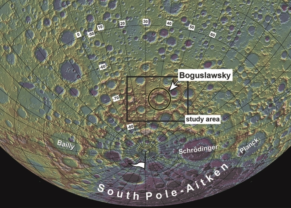 Topographic map of the southern sub-polar region of the Moon showing the location of Boguslawsky crater. Image credit: Ivanov et al., 2015 via Arizona State University/LROC.