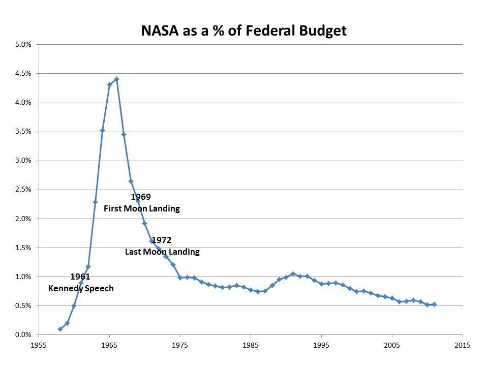 Распространенное заблуждение - если говорить о 4%, то этой цифры достигал общий бюджет NASA во время работы над программой "Аполлон" (и в течение всего пары лет), но речь не о ВВП, а об общем федеральном бюджете за соответствующие годы. Доля от ВВП была существенно скромнее.