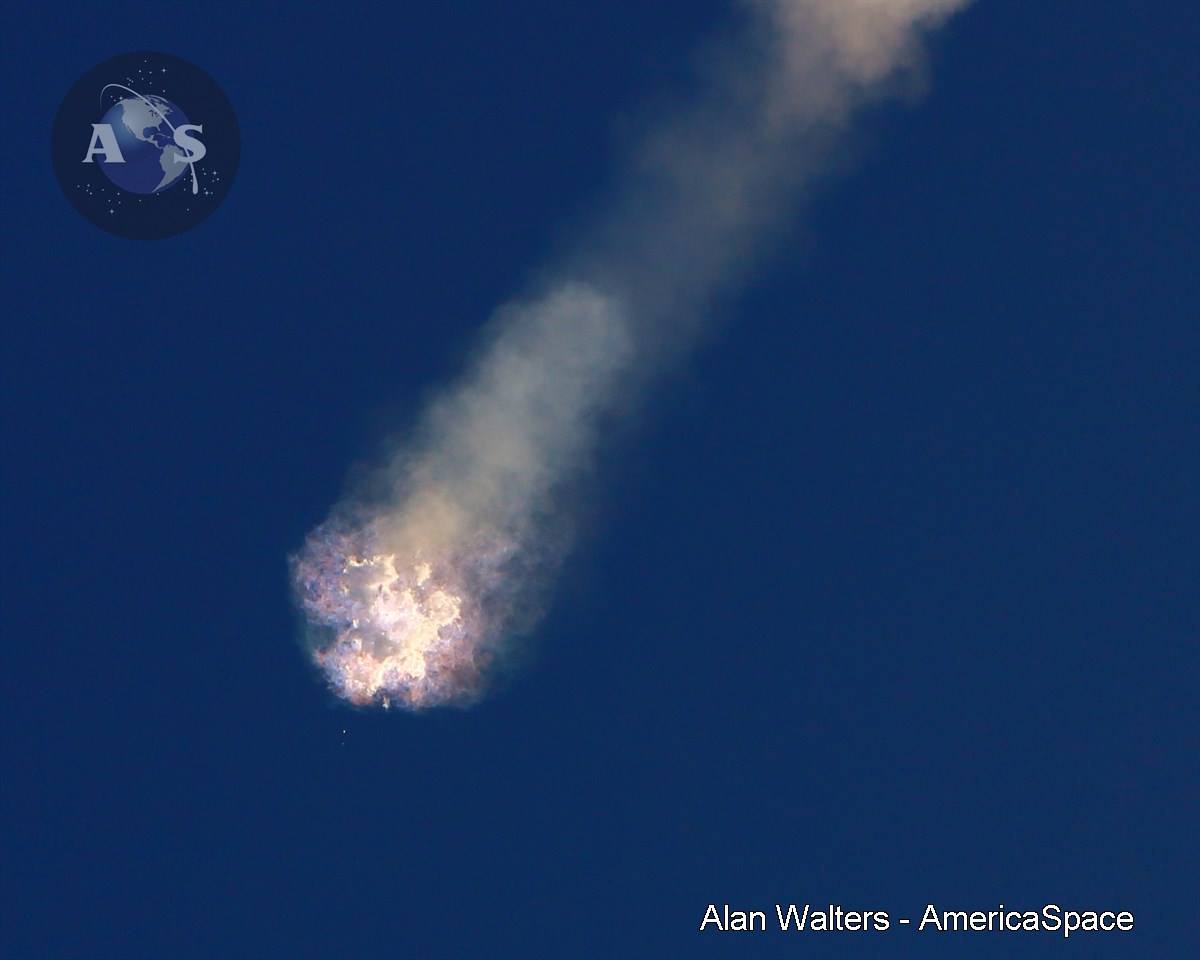 The nine plumes of the Merlin 1D engines flare as the CRS-7 vehicle disintegrates on 28 June. The maiden voyage of the Falcon 9 v1.2 ("Full Thrust"), carrying the SES-9 payload, was scheduled to follow CRS-7 in July 2015. Photo Credit: Alan Walters/AmericaSpace