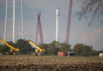 That stage has since arrived in Texas and was erected on the "Falcon Heavy Test stand" (L2) – a dual-purpose stand that can be used for both Falcon Heavy and Falcon 9 testing.